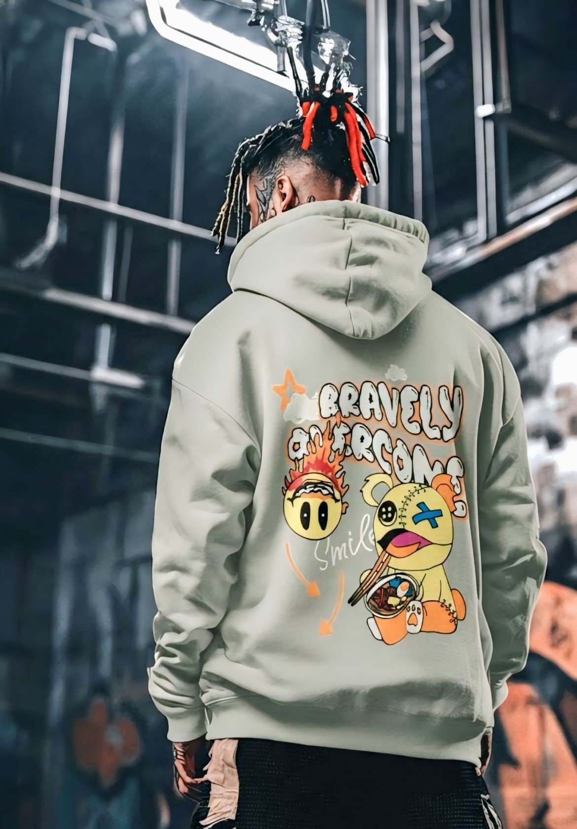 Designed for those who love standout fashion, this oversized hoodie features a unique “Bravely Overcome” print with vibrant cartoon-style characters — including a fiery smiley face and a stitched bear enjoying noodles. The mix of playful art and motivational text gives it a modern urban edge that instantly catches attention.